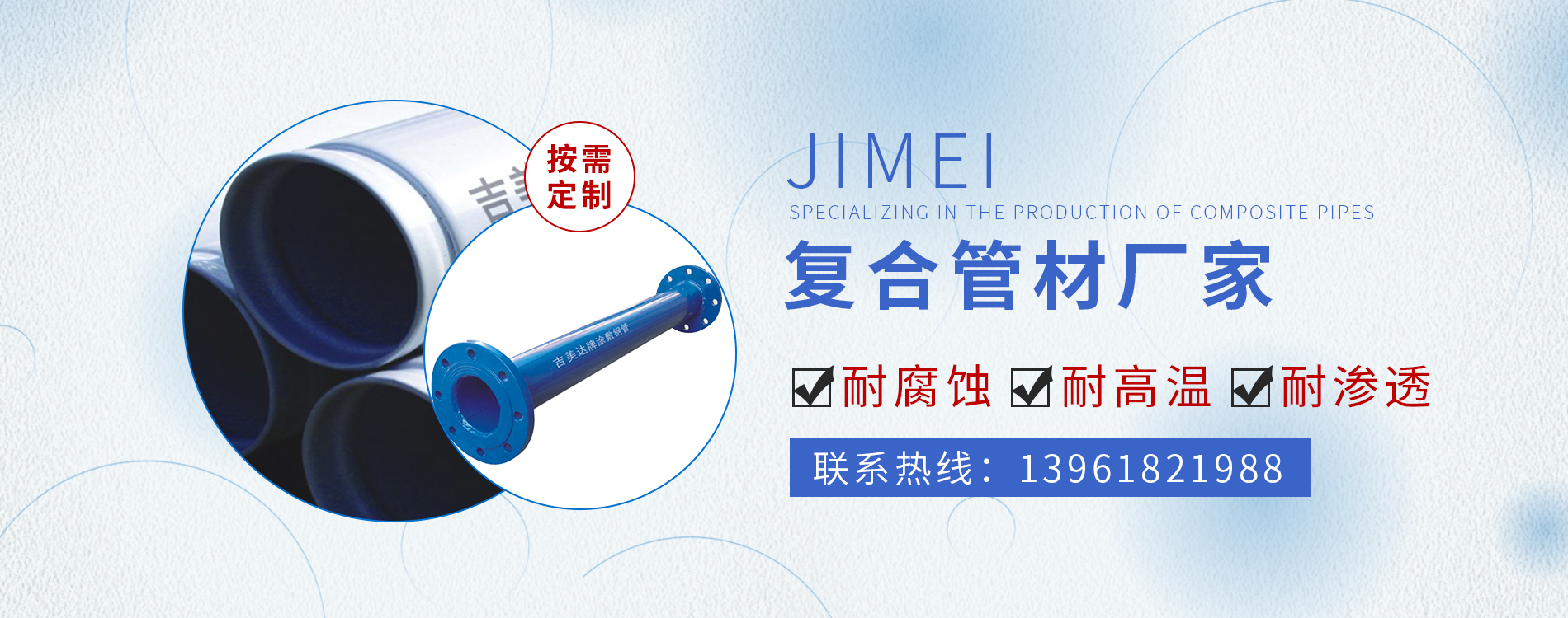 常州市吉美管業有限公司,是一家專業生產復合管材的生產企業。 依靠公司技術力量和多年的實踐經驗,可年生產內襯塑、內襯外涂、內外涂PE、PEX、EP復合管道以及工業防腐管道等多種復合管材及管件10萬噸的生產能力。